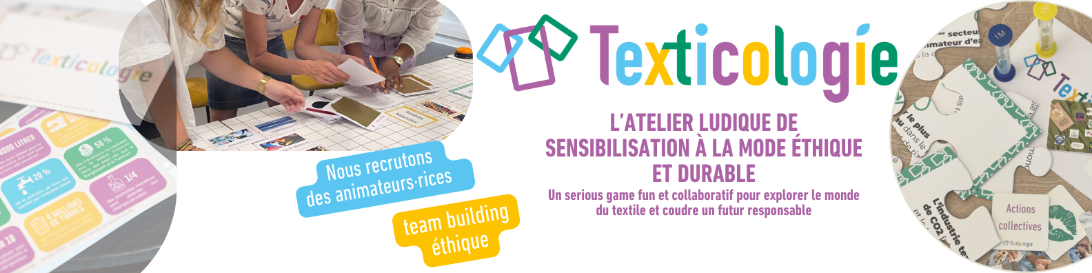 Née en 2023, texticologie propose un atelier-jeu sous forme de challenge en équipe afin de sensibiliser sur les impacts environnementaux et sociaux de l’industrie textile.